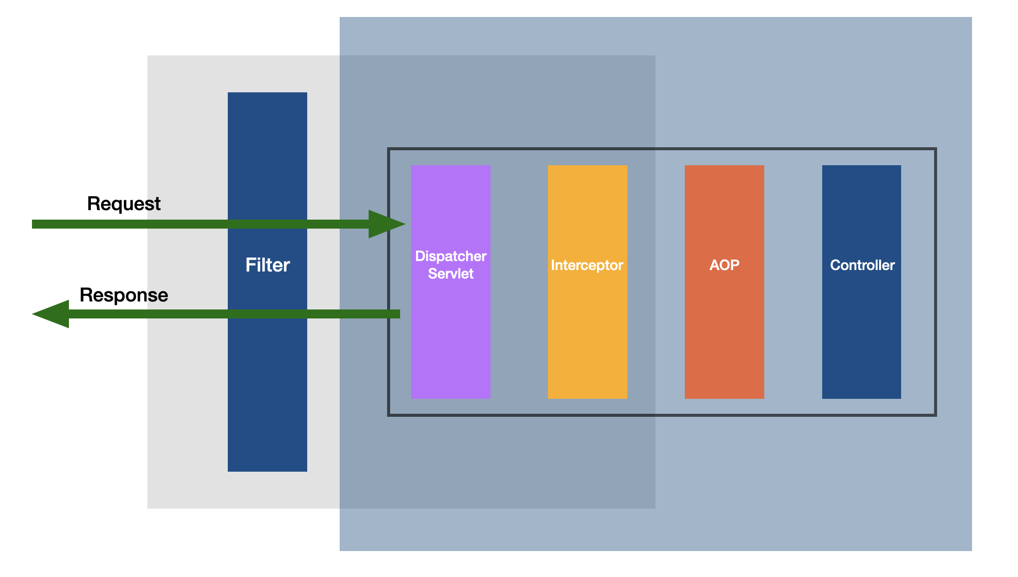필터를 통해 한번 걸러진 요청이 그 다음인 Dispatcher Servlet 으로 들어오고, 그 뒤에는 인터셉터나 프록시 패턴이 적용된 AOP 등을 거쳐서 원하는 위치에 도달하게 됩니다.
