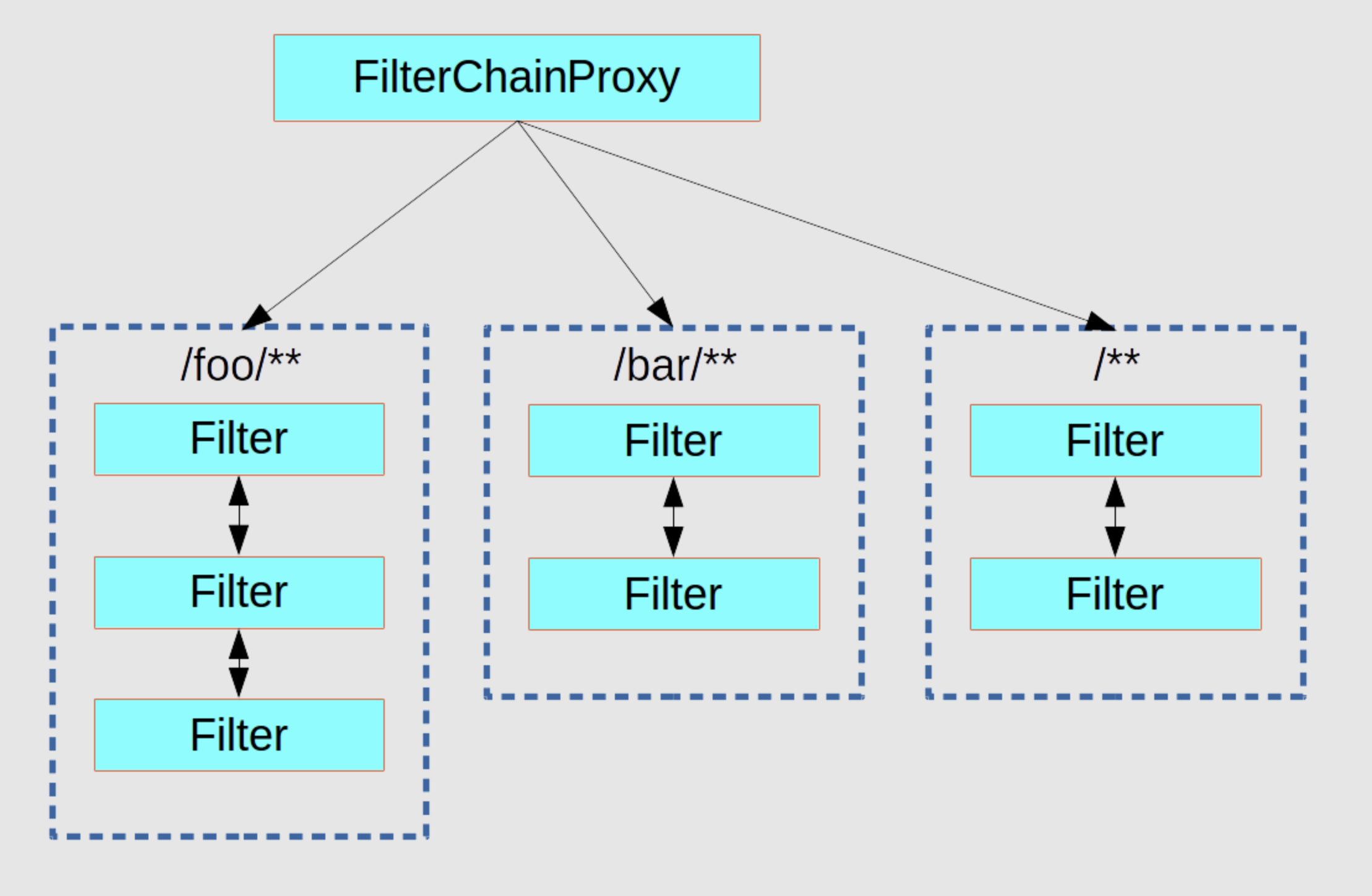 위의 그림을 보면 "/foo/**" 요청형식과 맞을때는 3개의 필터를 타도록 되어있고, "/bar/**" 요청에는 2개의 필터를 타게 만들어져 있습니다. 이 내용은 SecurityConfig 를 설정해보았거나 url pattern 을 설정해보았다면 이해할 것입니다.