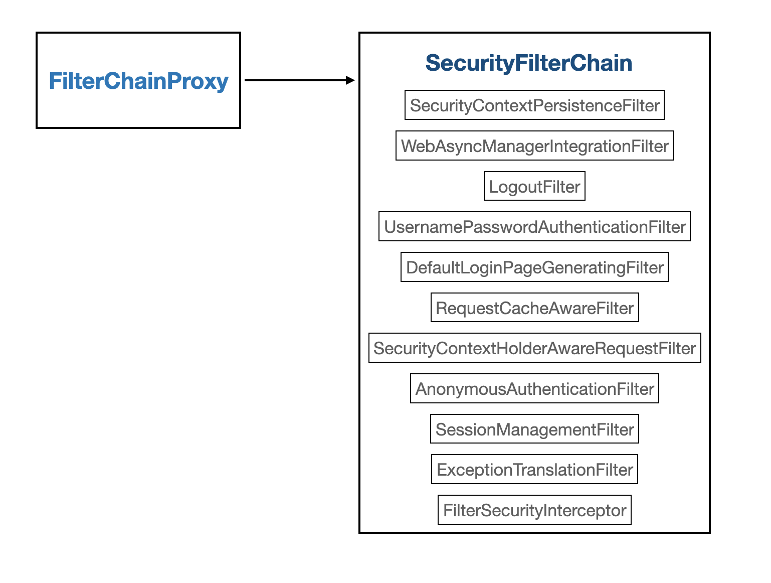 SecurityFilterChain이 파란 점선안의 내용이라고 보시면 됩니다. FilterChainProxy도 웹에 대한 요청접근을 위임하기 위해