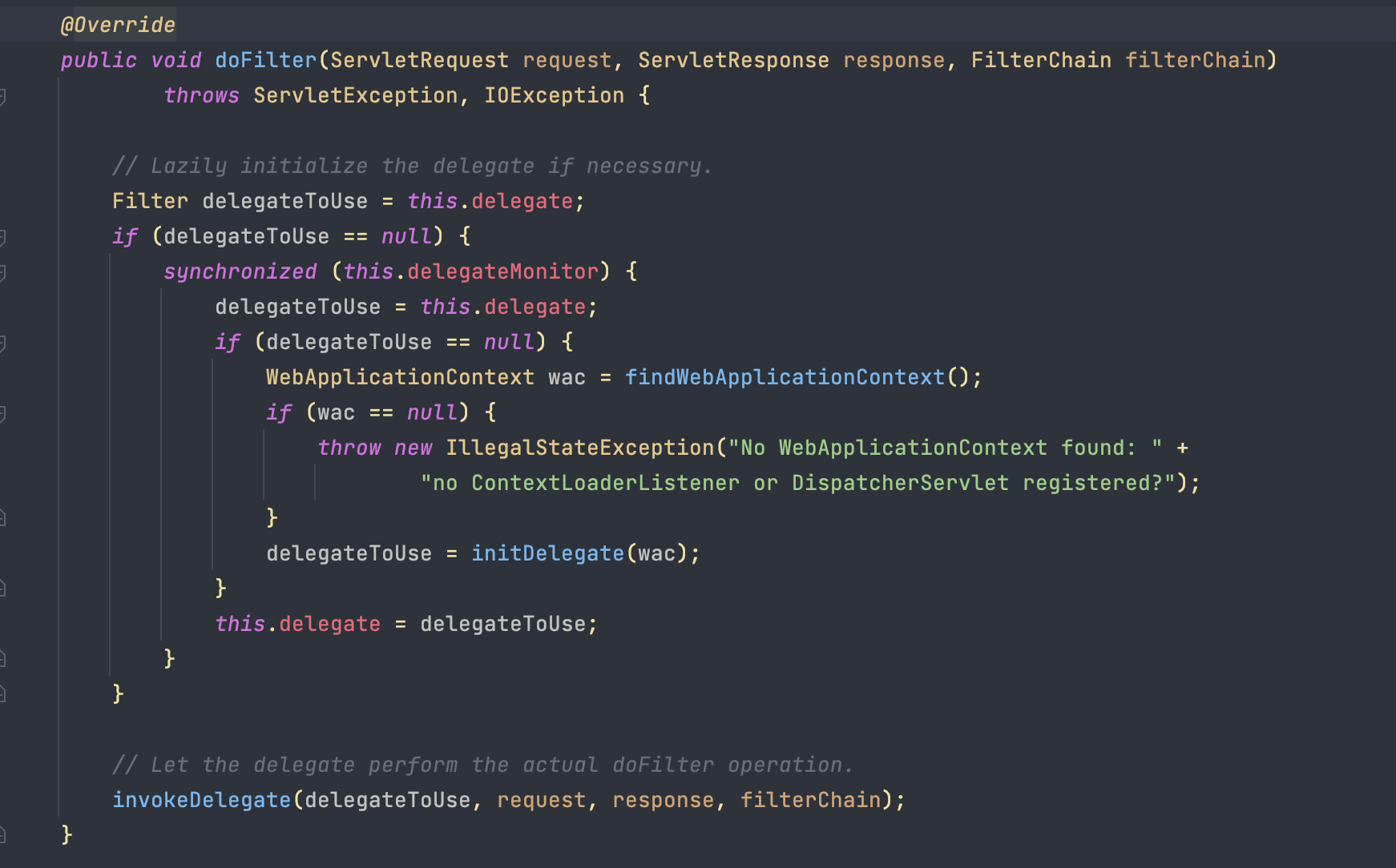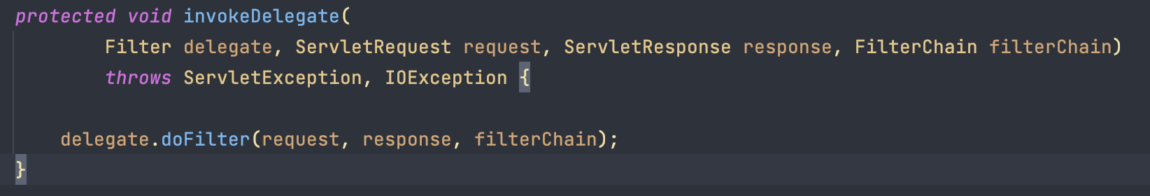 DelegatingFilterProxy 에 있는 doFilter 입니다. WebApplicationContext 에서 등록된 필터를 찾아 위임을 해주고 있습니다.