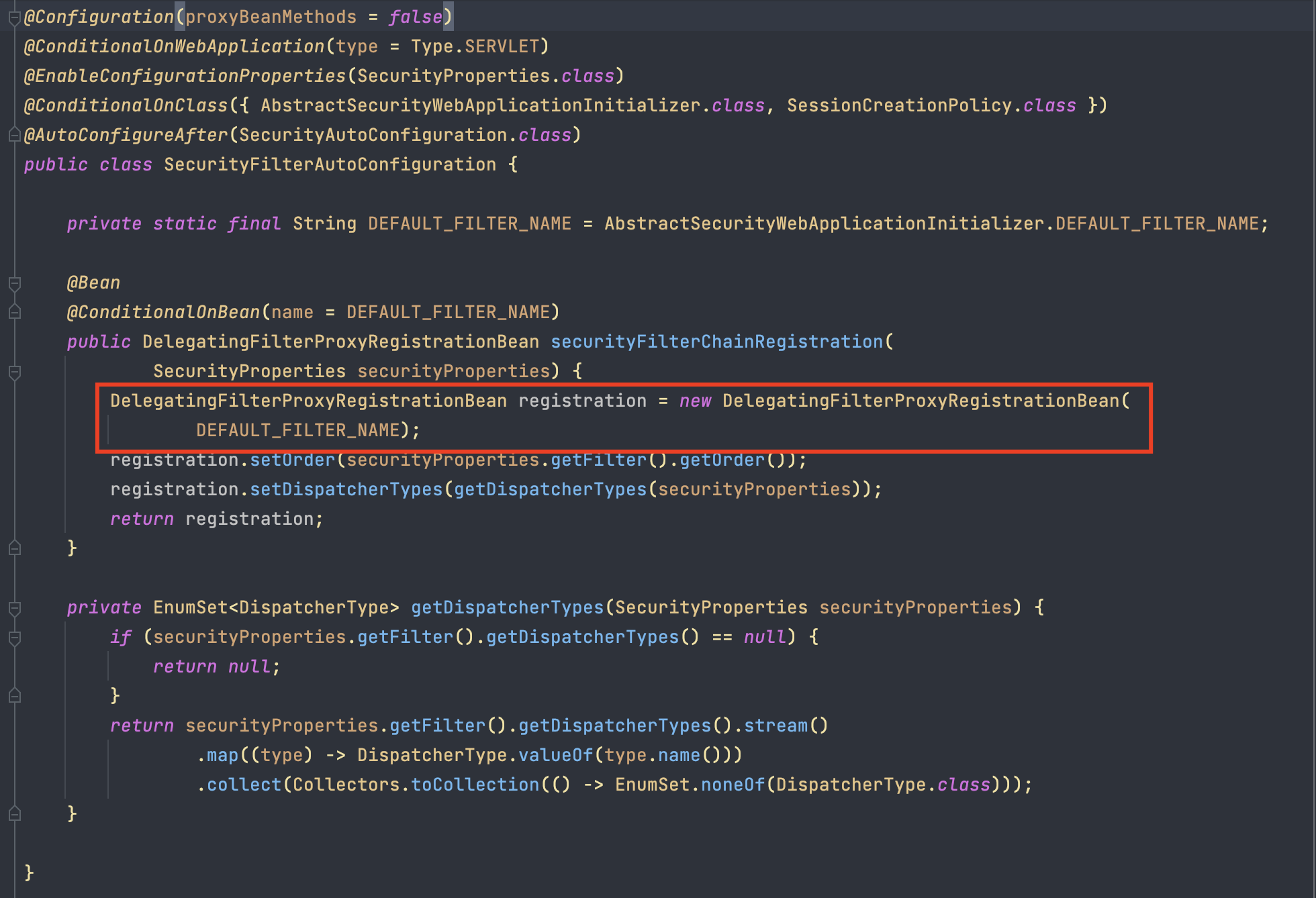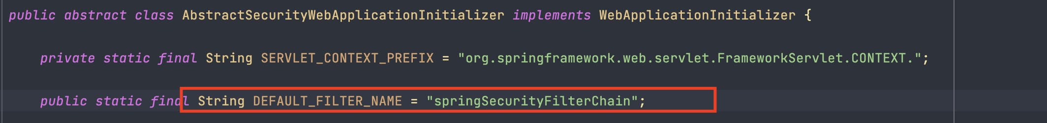 DEFAULT_FILTER_NAME 은 앞의 게시물에서 보았던 springSecurityFilterChain 입니다. 이걸로 FilterChainProxy 가 등록되었다는 것을 알 수 있습니다.