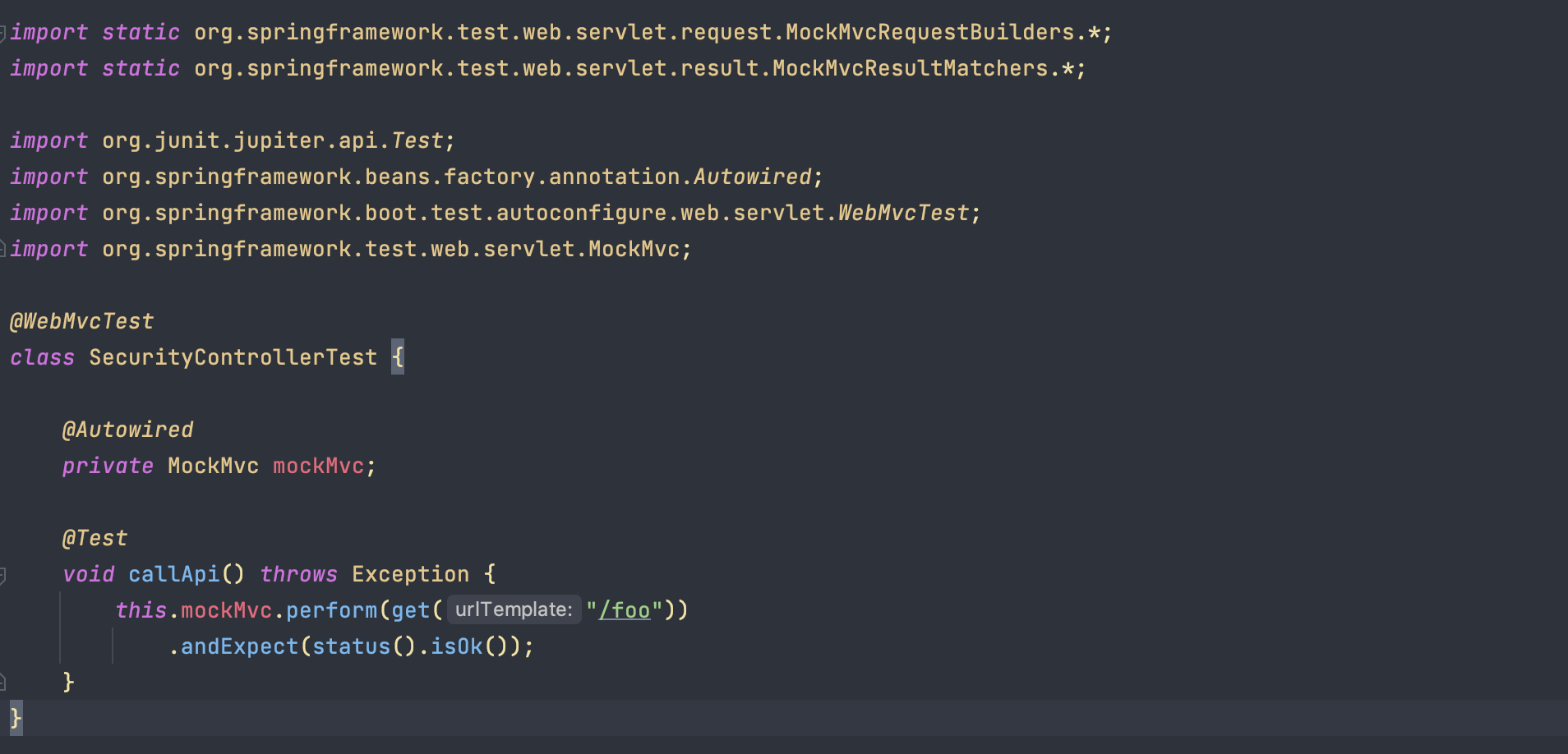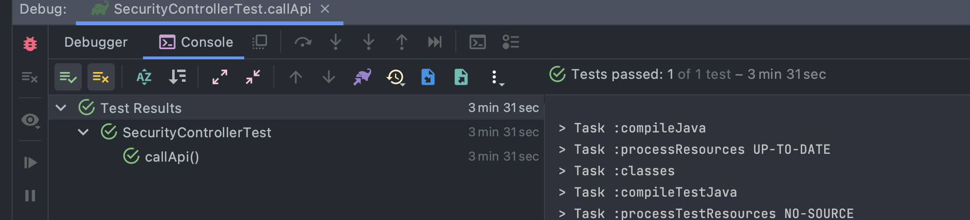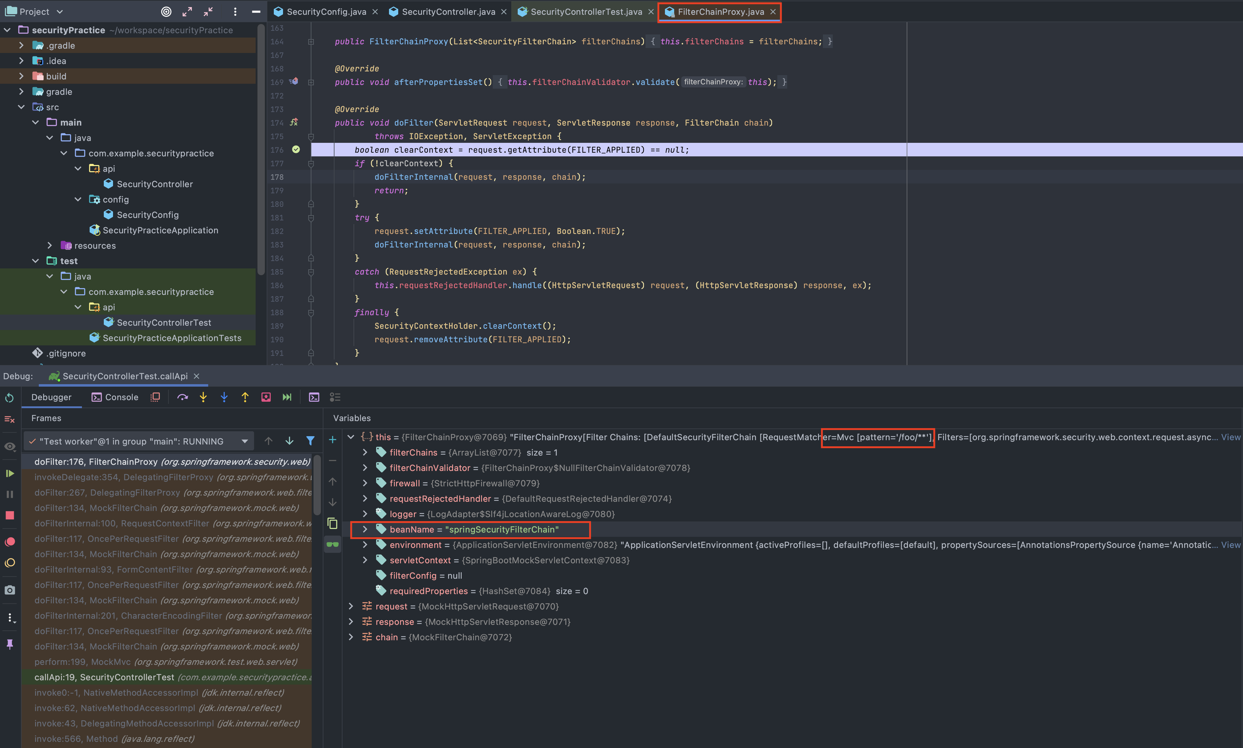 이제 테스트를 돌려 작성한데로 Controller 를 호출하는지와, 동시에 FIlterChainProxy 를 타는지 디버깅으로 실행해보겠습니다.