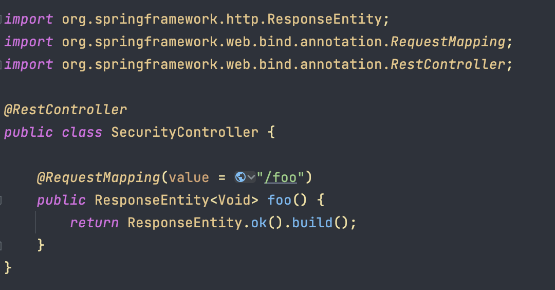 Controller 도 간단하게만 구성하였습니다. Security에 등록된 경로를 매핑하는 컨트롤러를 하나 만들어주었습니다.