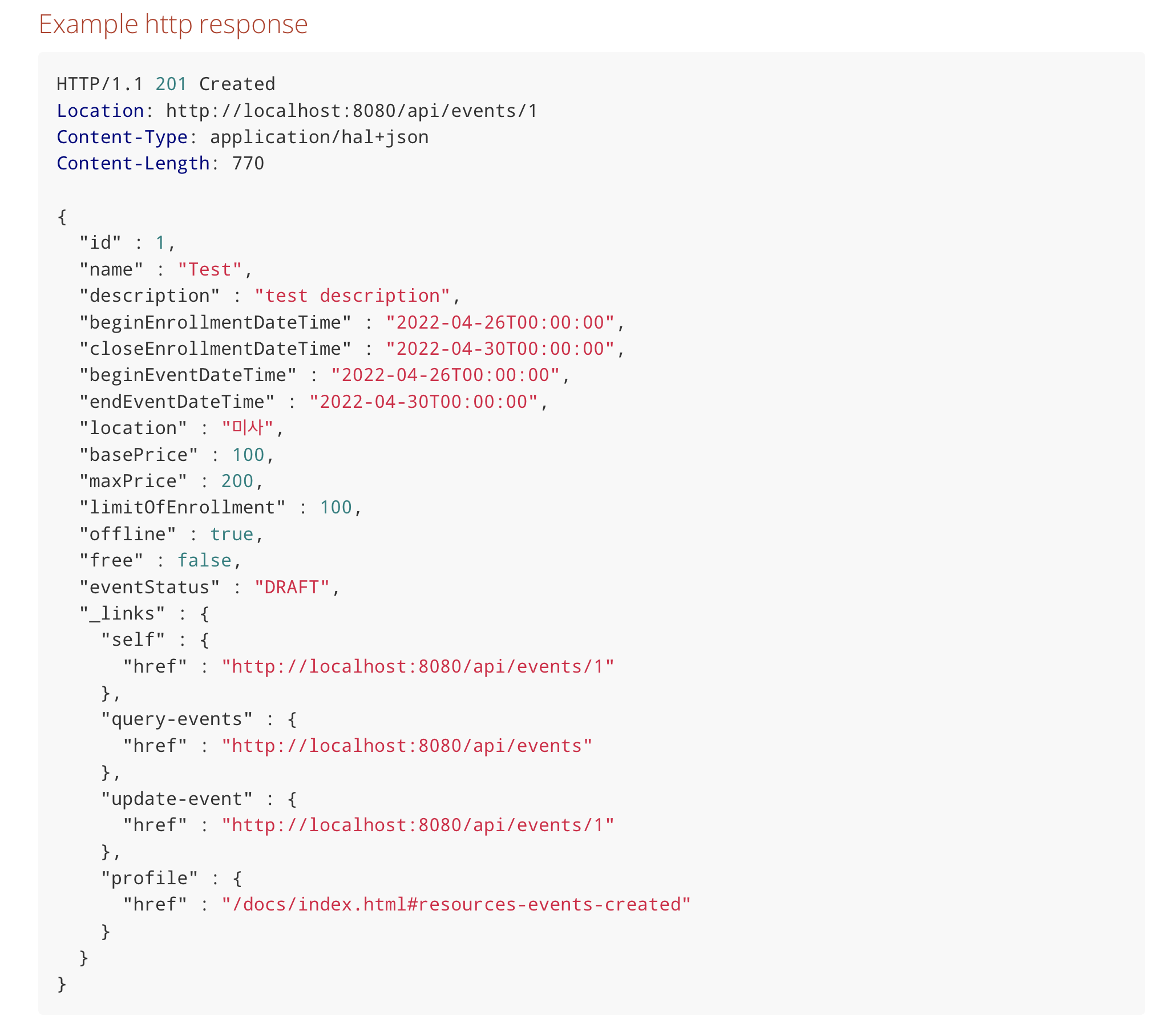 이와 같이, EventResource 에 원하는 링크들을 추가하여 REST API 를 만족시킨 모습입니다.