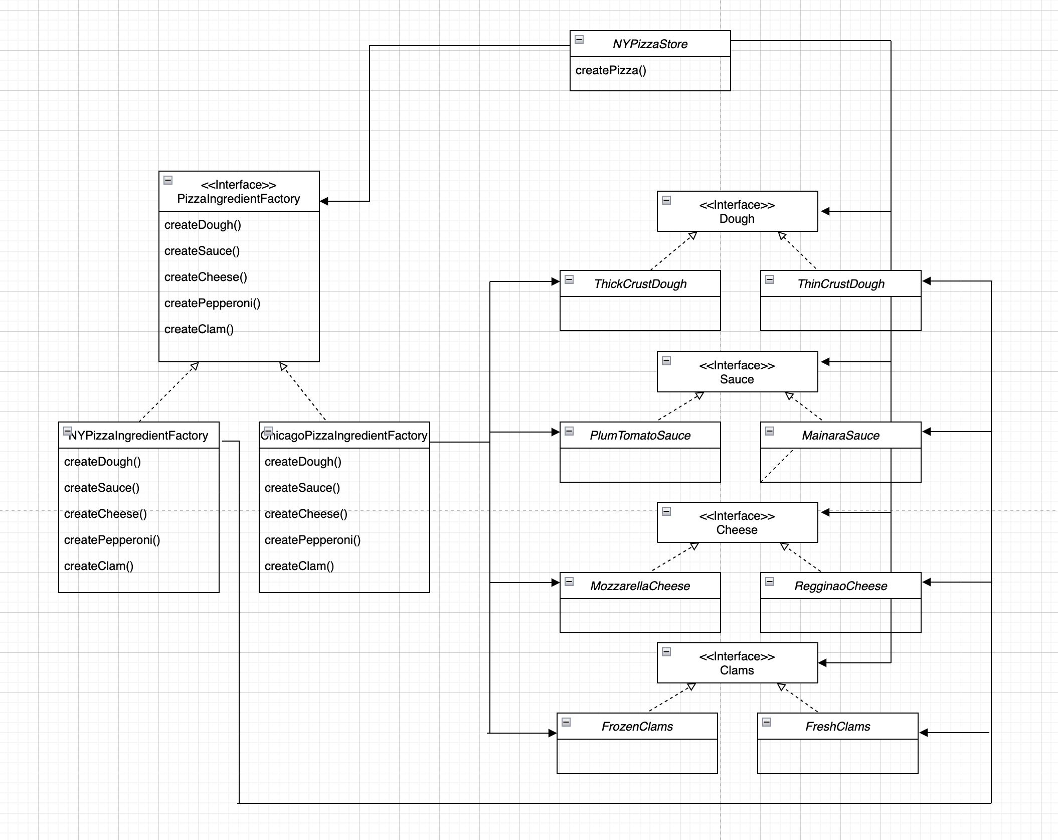 Dough, Sauce 등 인터페이스로 원재료의 틀을 정하고, 각 재료의 구상 클래스를 둔 후에 재료 공장에서 각 지역에 맞는 재료를 만들어 낸다고 보면 되겠습니다.
