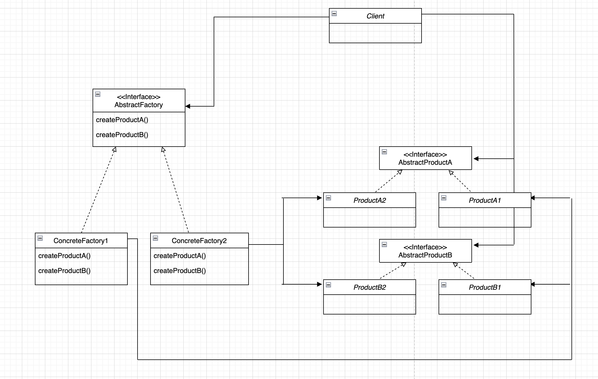 이런 모양이 됩니다. AbstractFactory 는 모든 구상 팩토리에서 구현해야 하는 인터페이스이고, 제품을 생산하기 위한 메소드들이 정의되어 있습니다. 구상 팩토리에서는 서로 다른 제품군을 구현하고, 클라이언트에서 제품이 필요하면 팩토리에서 적절한 걸 골라서 쓰게 됩니다.