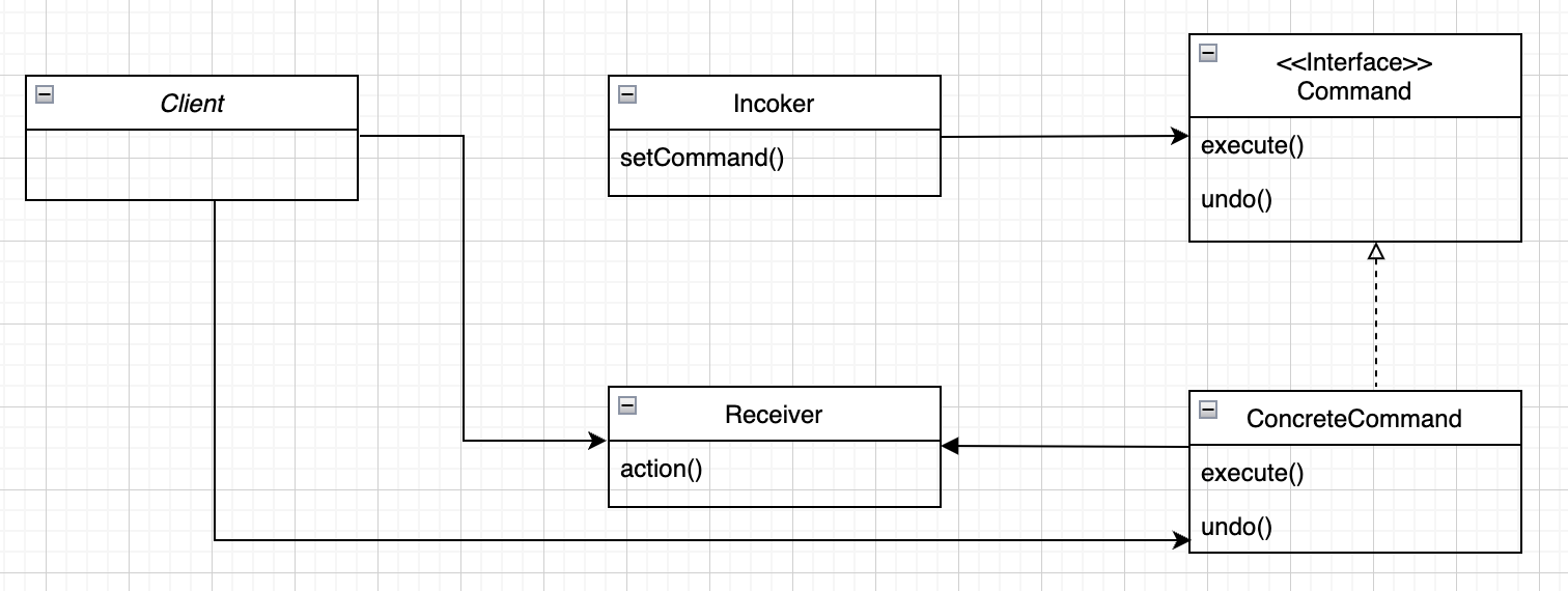 Command 는 모든 커맨드 객체에서 구현해야 하는 인터페이스입니다. 모든 명령은 execute() 메소드 호출을 통해 수행되며, 이 메소드에서는 Receiver 에 특정 작업을 처리하라는 지시를 전달합니다. Invoker 는 execute() 메소드를 호출함으로써 커맨드 객체에게 특정 작업을 수행해 달라는 요청을 하게 됩니다.