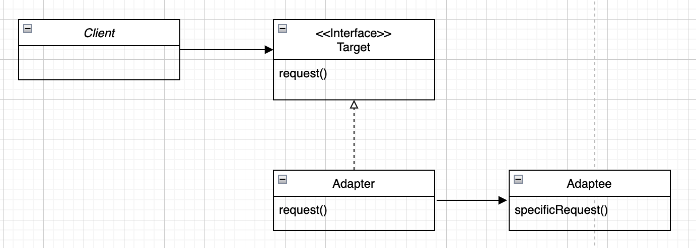 클라이언트는 타겟 인터페이스에 맞게 구현되어 있고, 어댑터는 타겟 인터페이스를 구현하며 여기에 어댑티 인스턴스가 들어있습니다.
