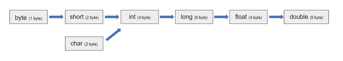 boolean을 제외한 기본형 7개의 자동형변환은 그림과 같이 왼쪽에서 부터 오른쪽으로 자동형변환 되며, 오른쪽에서 왼쪽으로의 변환은 명시적으로 형변환연산자를 써줘야 한다.
